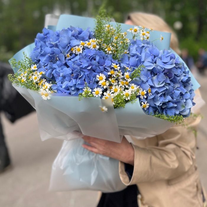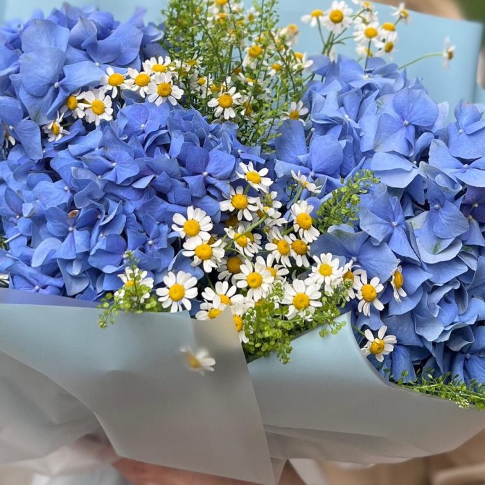 Гортензия – 3 шт.Лента атласная – 1 шт.Упаковка дизайнерская – 6 шт.Ромашка – 6 шт.Гринбелл – 4 шт.