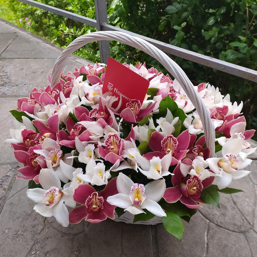 Орхидея Цимбидиум – 4 шт.Корзина плетеная – 1 шт.Оазис флористический – 3 шт.зелень декоративная – 10 шт.