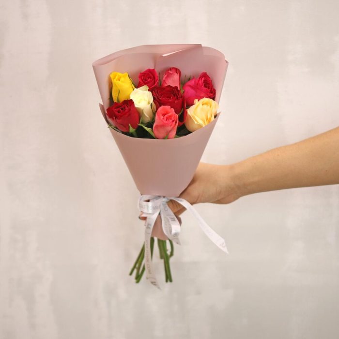 Букет из 9 роз мини яркий микс 35-40 см (Кения) в упаковке