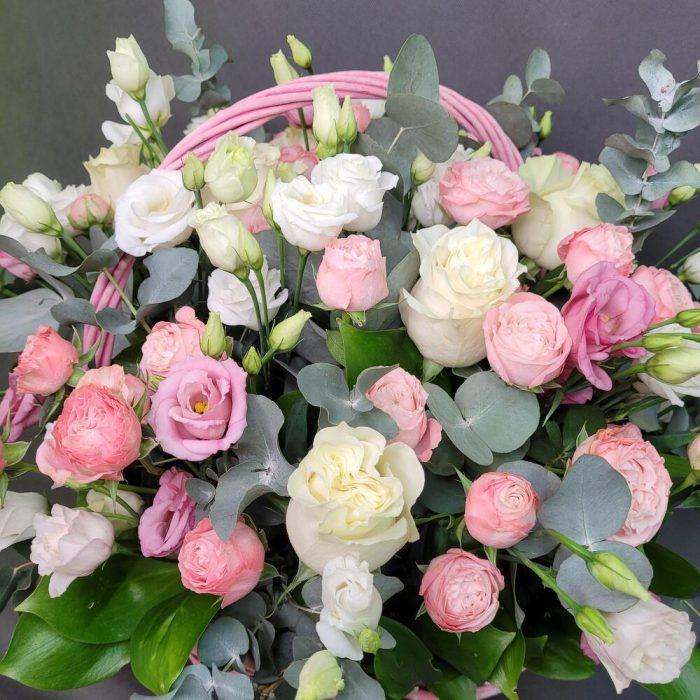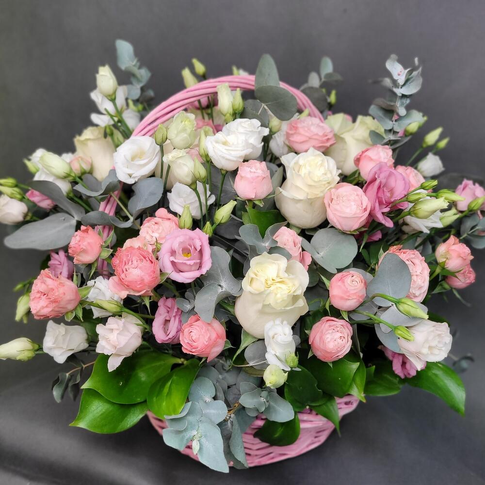 Корзина из роз и лизиантуса с эвкалиптом
